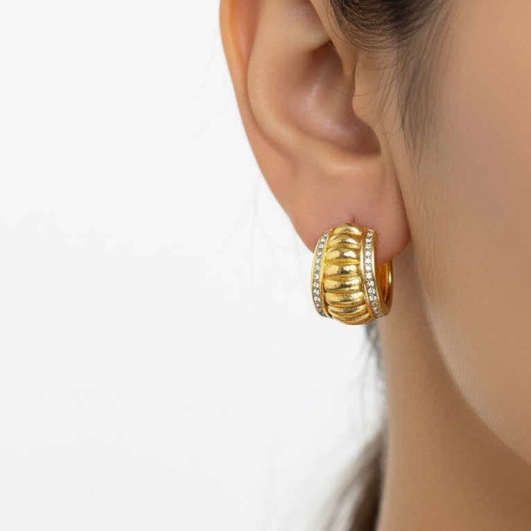 Elevate your everyday style with these textured dome hoop earrings, designed with a ribbed golden...