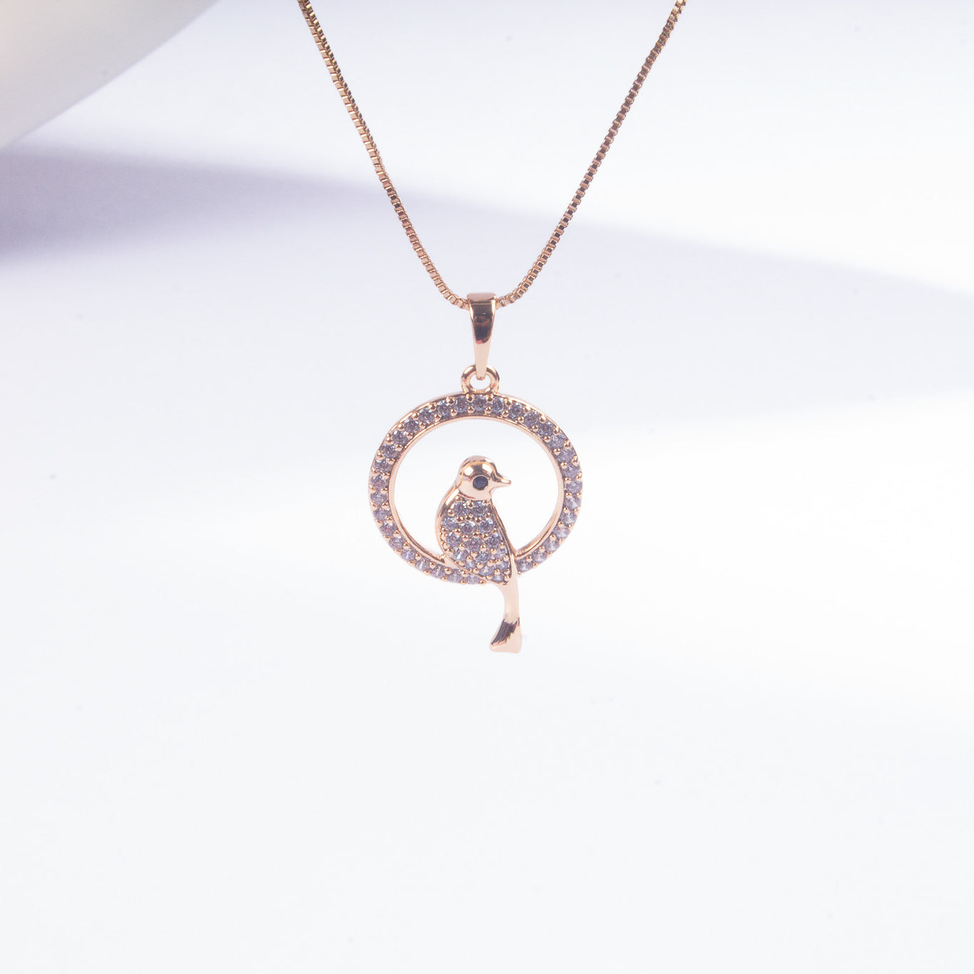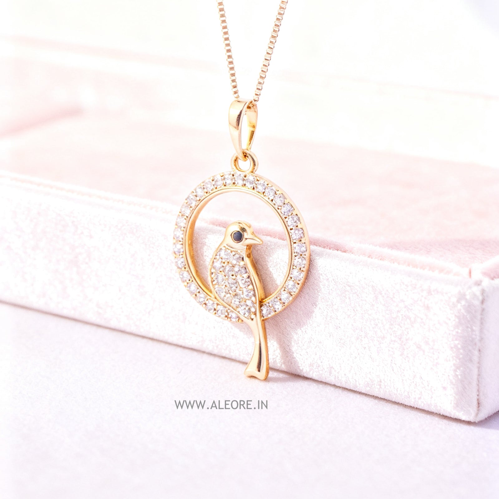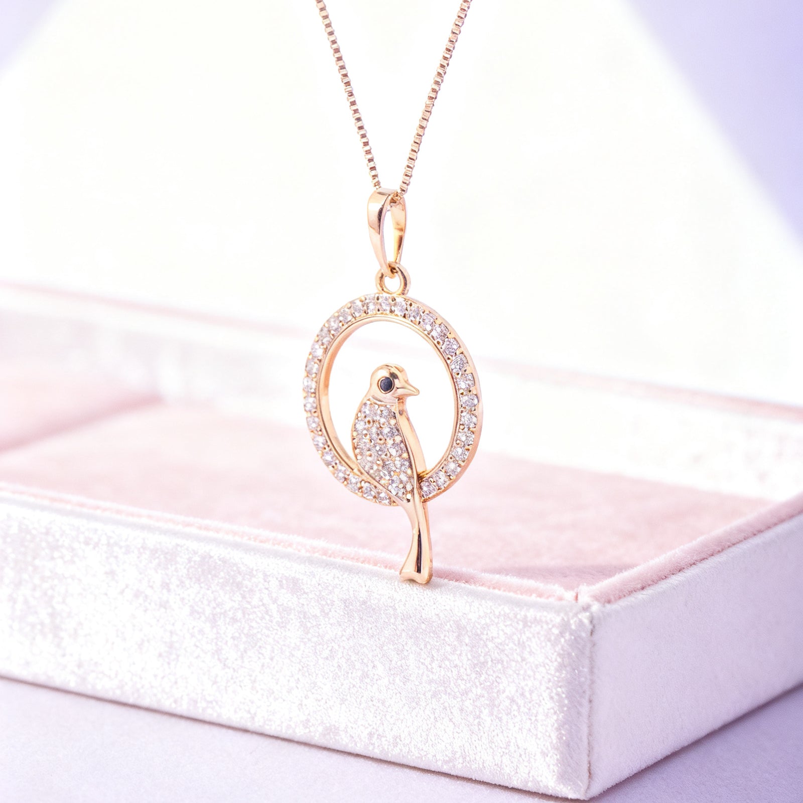 Adorn yourself with grace. This exquisite gold-plated necklace features a charming canary silhouette, beautifully encircled by sparkling cubic zirconia stones. A symbol of peace and elegance, it's perfect for adding a touch of sophisticated shimmer to any outfit, day or night.