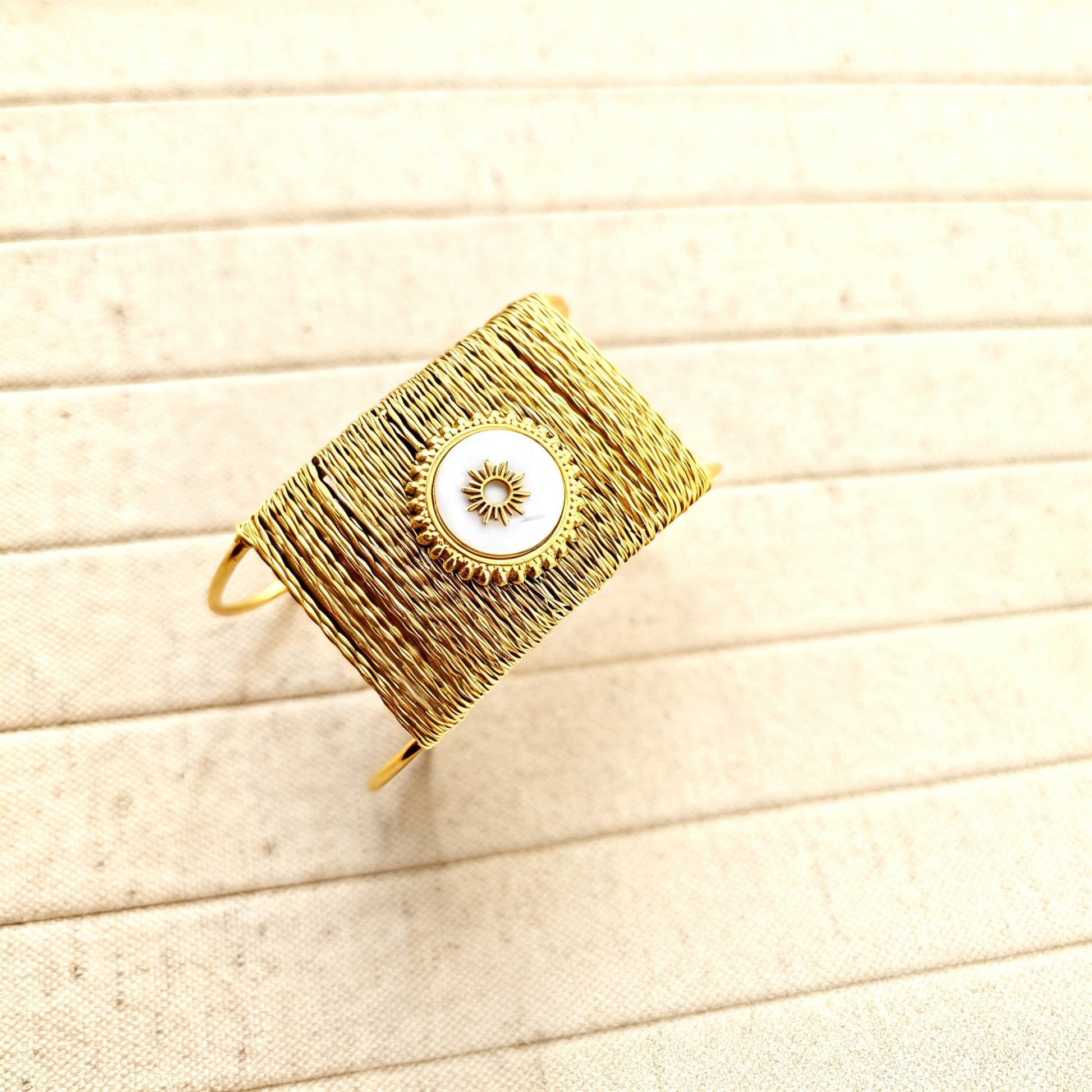 This unique bracelet showcases a radient mother-of-pearl sun charm at its center, surrounded by a band of finely woven, golden toned wire. It’s a streking and artistic piece designed to add a celestial glow to your wrist.