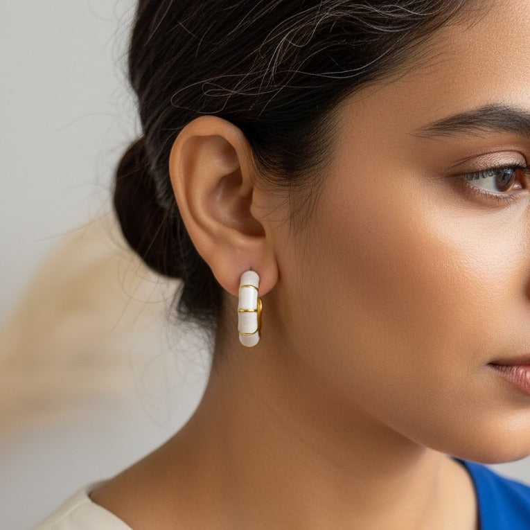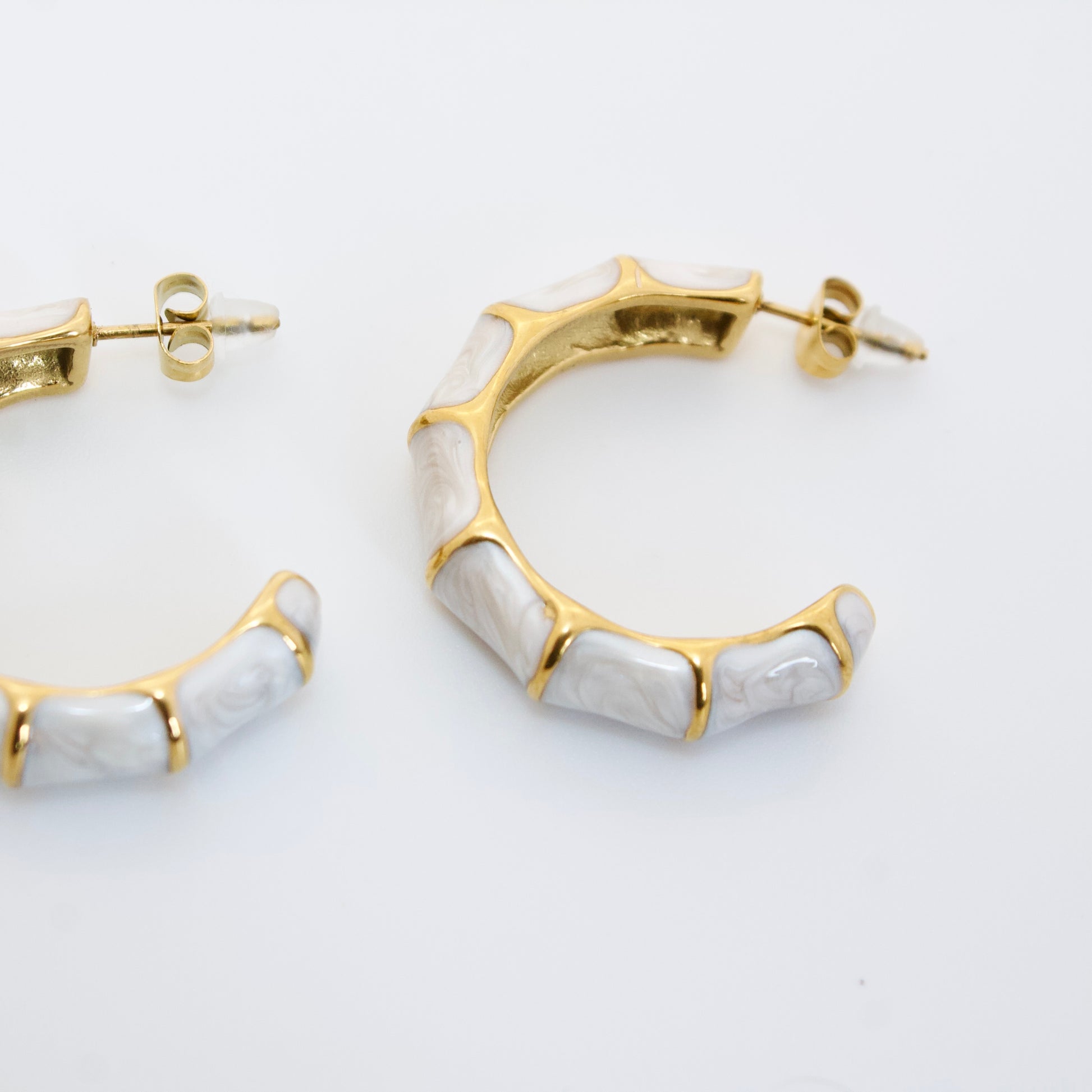 Elevate your everyday style with these uniquely sculpted hoop earrings. Inspired by organic bamboo shapes, they feature smooth white enamel details contrasting with radiant gold-tone metal, offering a fresh and modern twist on a classic hoop design